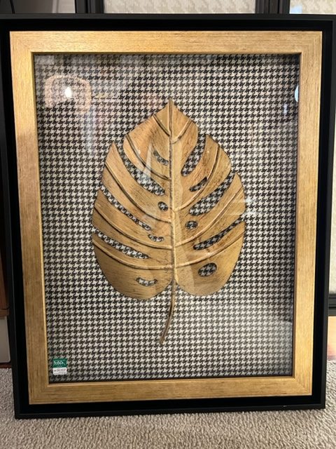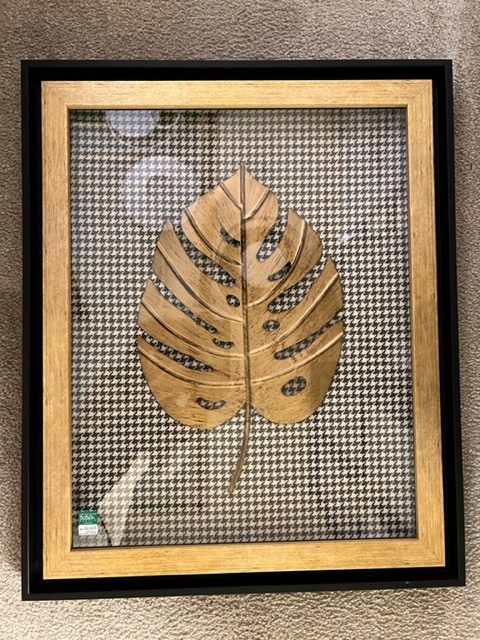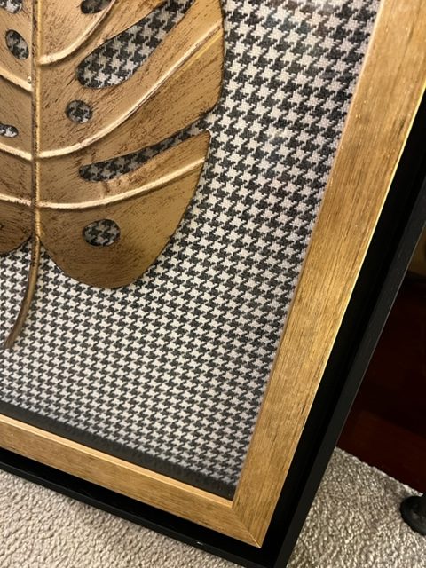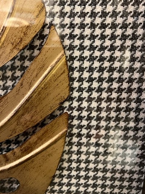 CUADRO HOJA METAL , ENMARCADA EN VITRINA , CON FONDO TELA PATA DE GALLO NEGRA