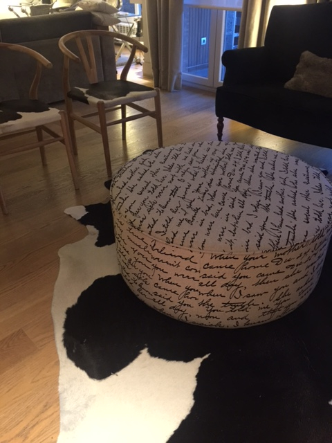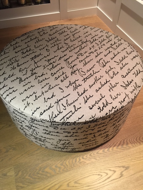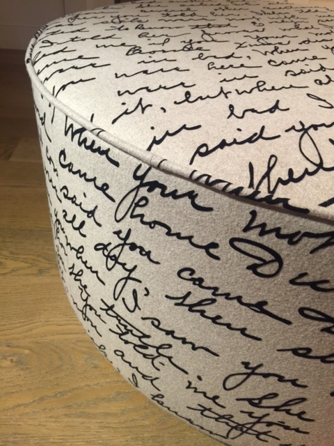 Pouff o mesa de centro con tela de franela gris y escrituras en negro, con vivo alrededor en la misma tela.